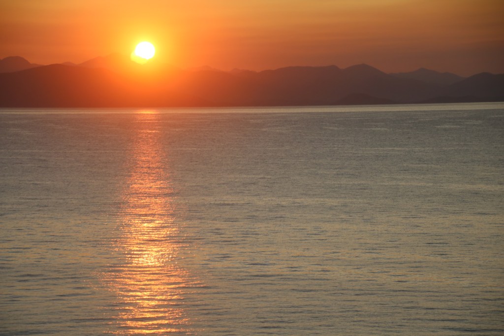 Minute um Minute verändert sich das Bild, die Blautöne der Bergketten sind gegen vorne dunkler, weiter hinten heller, der Himmel verfärbt sich immer mehr orangefarben, und kurz bevor die erste Wölbung der Sonne erscheint, kündigt sie sich mit intensivem Orange an, bis sie dann wie ein glühender Feuerball aufsteigt. Die ersten Sonnenstrahlen sind zu sehen, und verwandeln den Anblick der Küstenlinie, die nun blassere Töne in Grau hat.