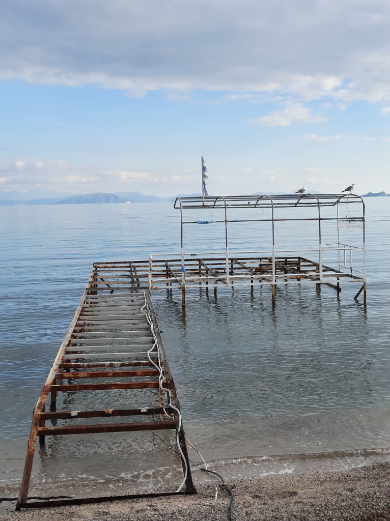 Auf der anderen Seite in der Ferne zeichnet sich eine schwarzblaue Küstenlinie ab, mit bergigem Hinterland. Die verschiedenen Hügelketten sind anfangs noch nicht klar zu erkennen, und werden von Augenblick zu Augenblick heller, und in unterschiedlichen Blautönen abgestuft zeichnen sie sich, je nach Entfernung ab. Der Himmel ist klar und wolkenlos, und kündigt in zarten Gelb- und Orangetönen die aufsteigende Sonne an. Vögel ziehen über dem Meer vorbei und am Himmel sind die Kondensationsstreifen zweier Flugzeuge zu sehen, die weiße Striche am hellblauen Himmel hinterlassen.